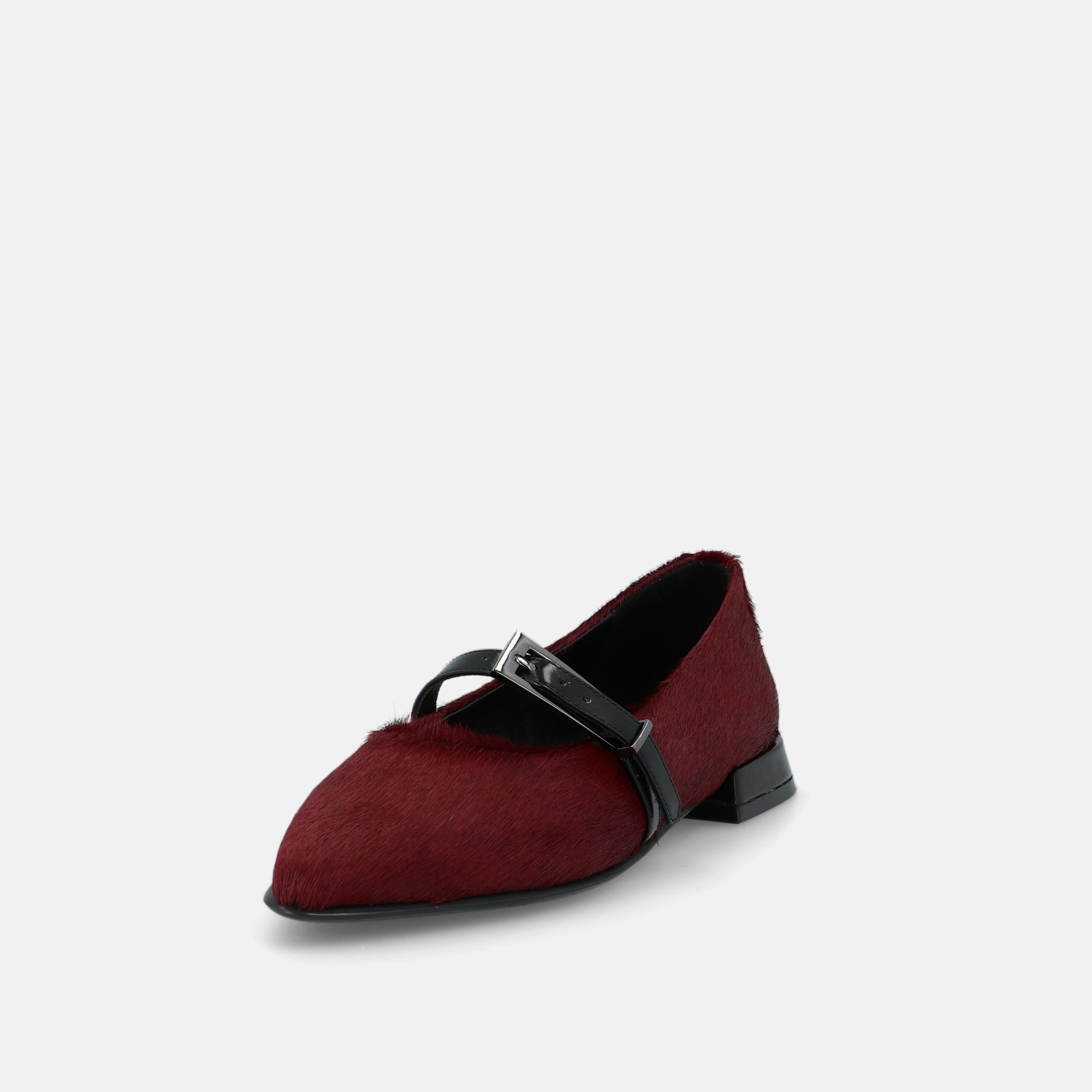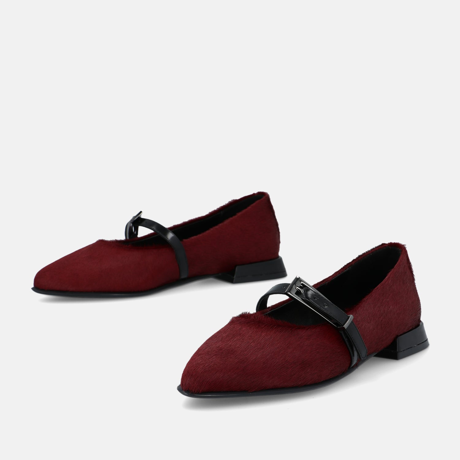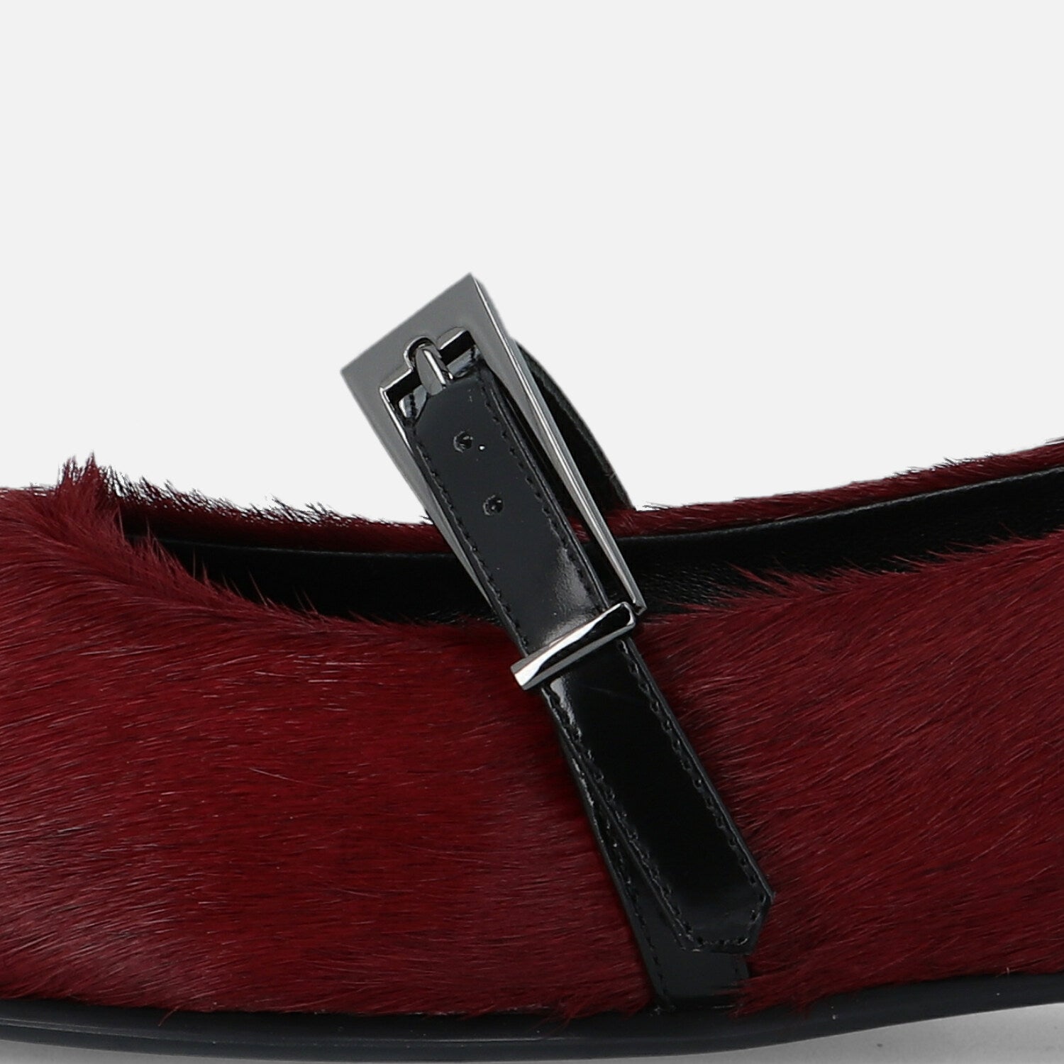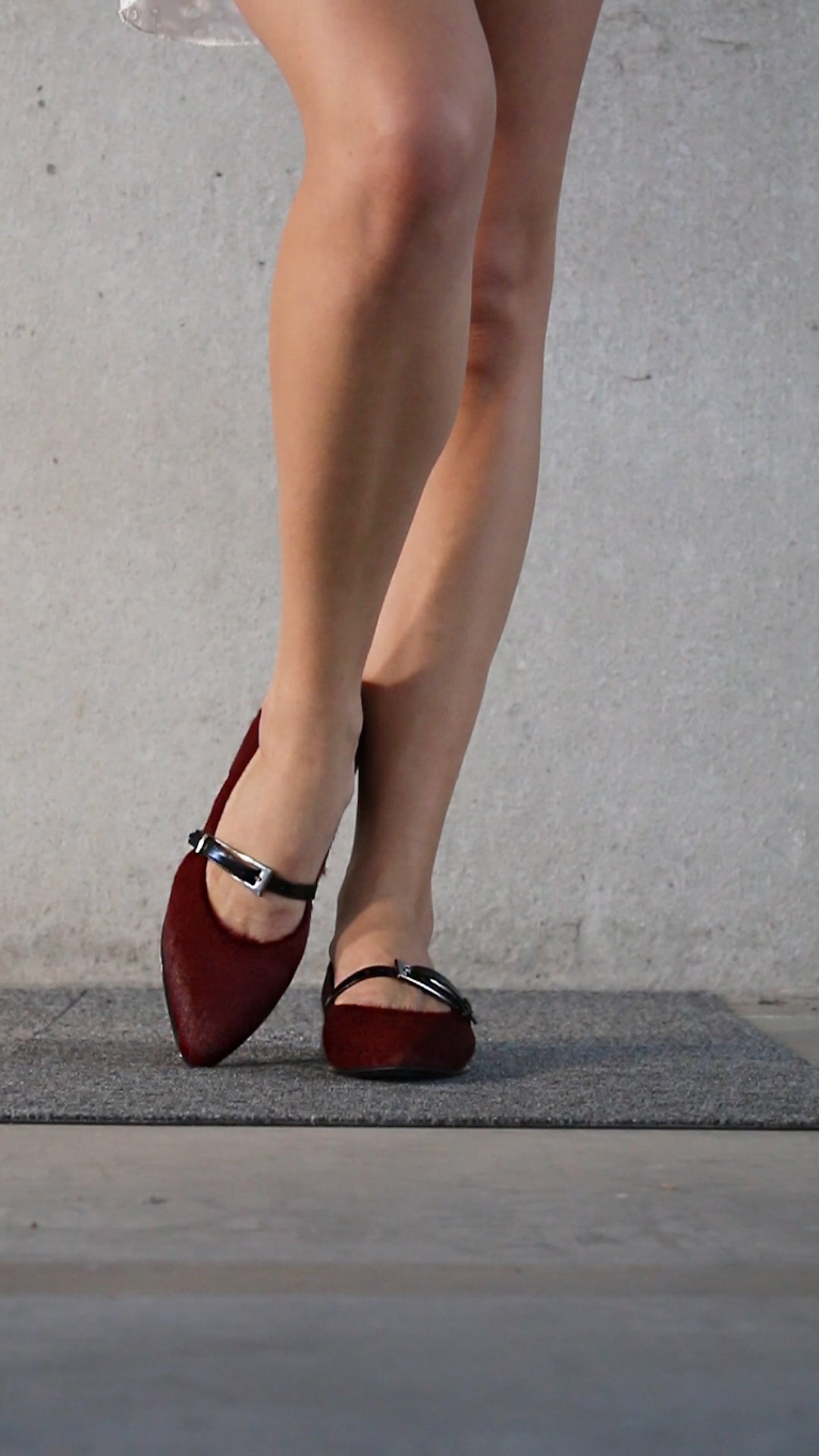The Lim Argot ballerinas combine sophisticated design and refined materials in a bold version. Crafted from leather with a ponyskin upper , they come in two colors: a bold cowhide print , with a bold and contemporary appeal, or an intense antique red , which exudes elegance and personality. The tapered line and thin strap with a black leather buckle create the perfect balance between femininity and urban style.