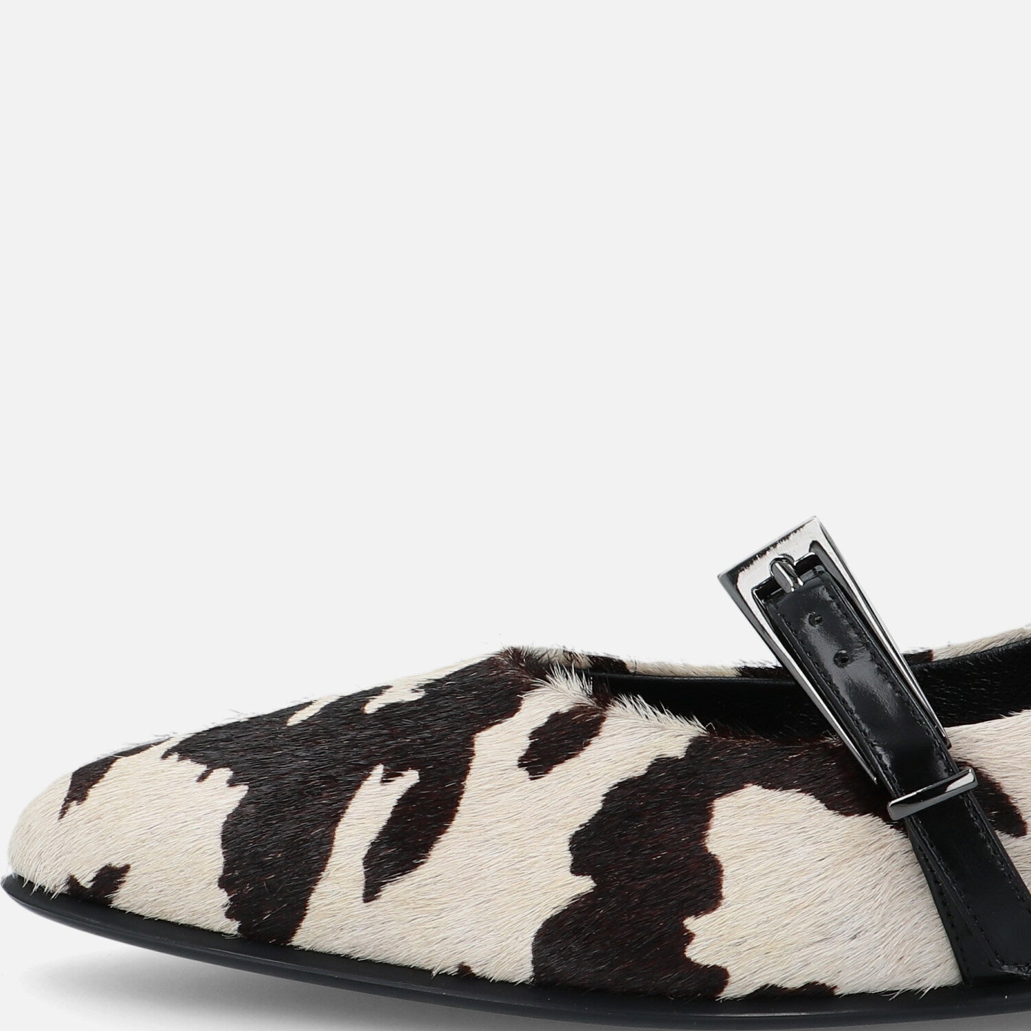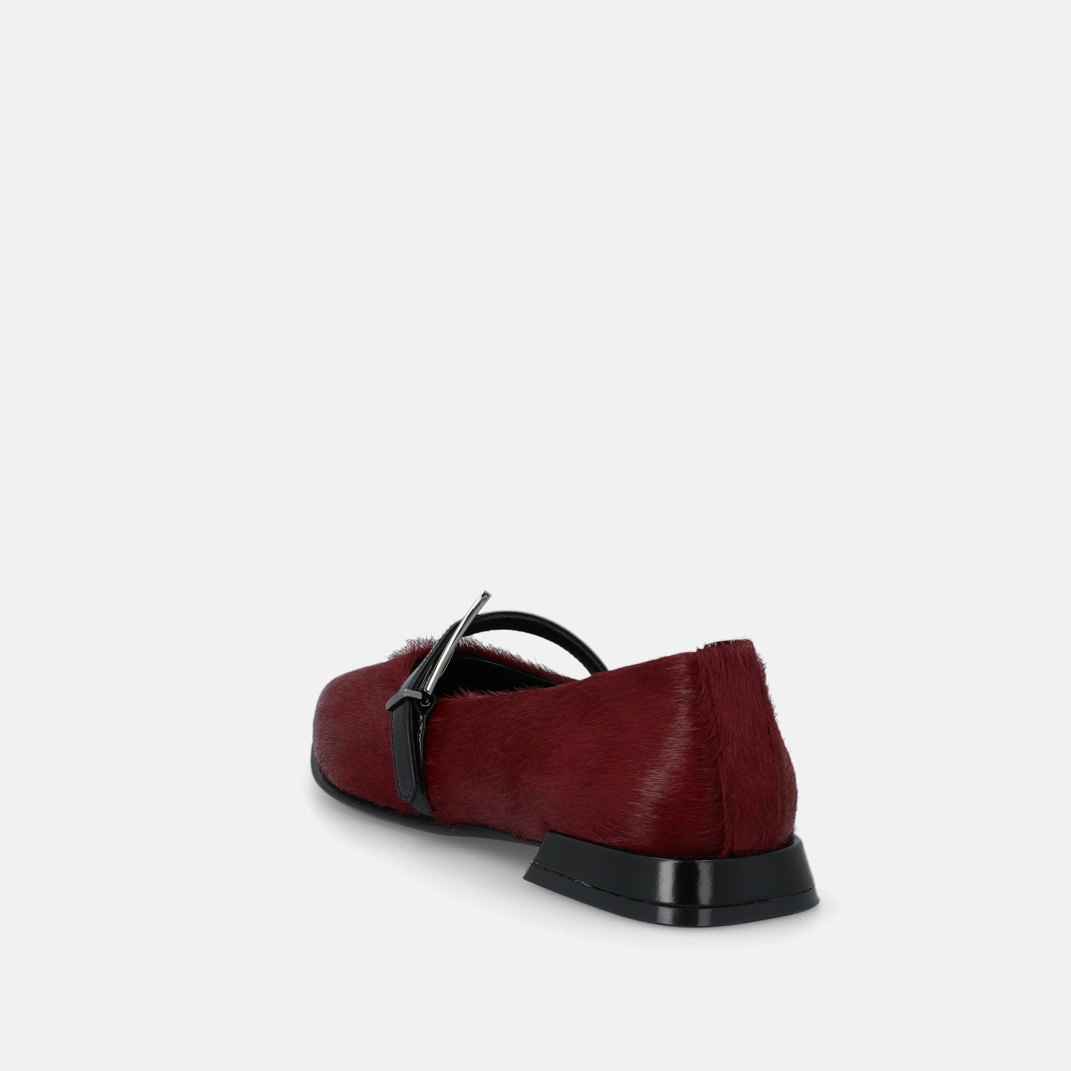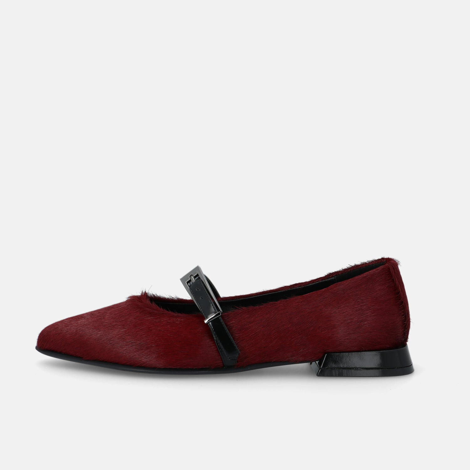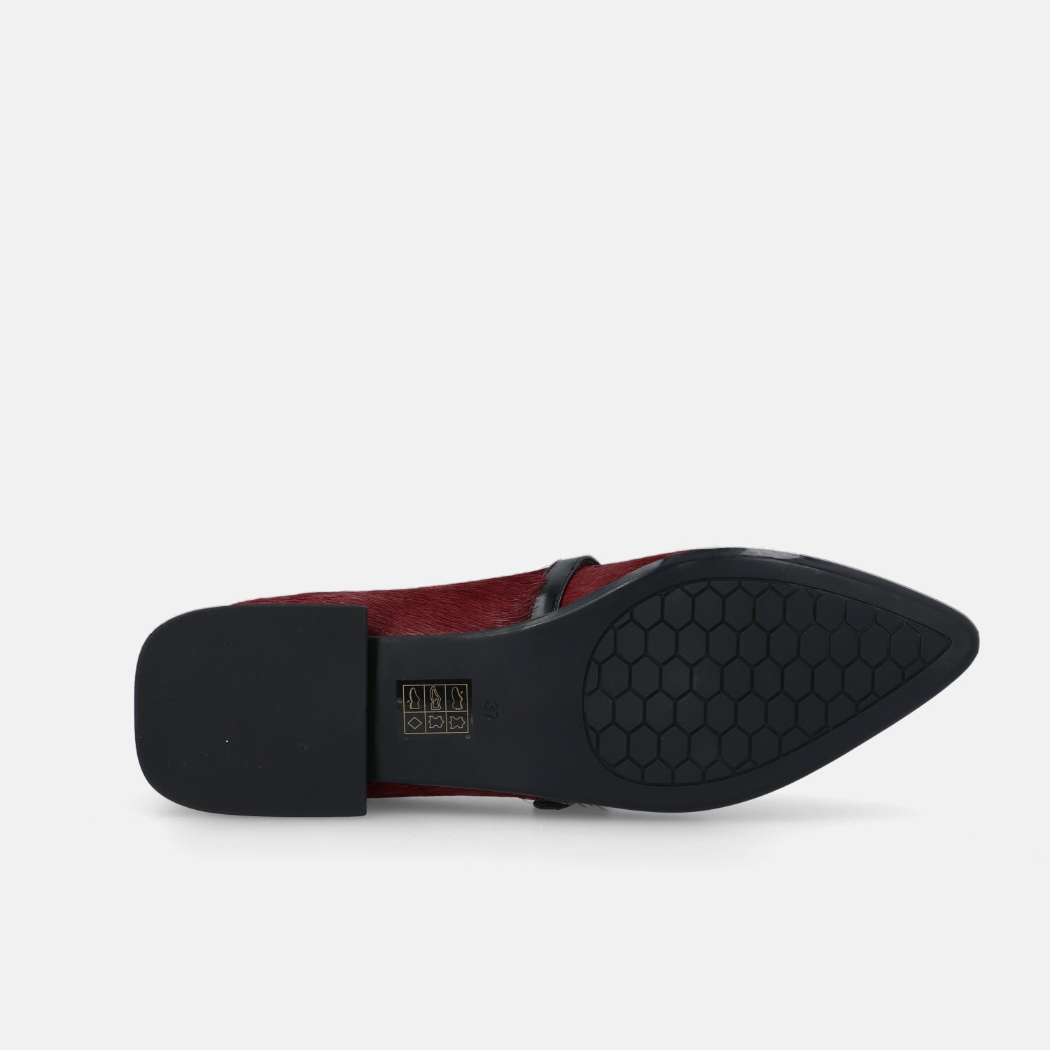 The Lim Argot ballerinas combine sophisticated design and refined materials in a bold version. Crafted from leather with a ponyskin upper , they come in two colors: a bold cowhide print , with a bold and contemporary appeal, or an intense antique red , which exudes elegance and personality. The tapered line and thin strap with a black leather buckle create the perfect balance between femininity and urban style.