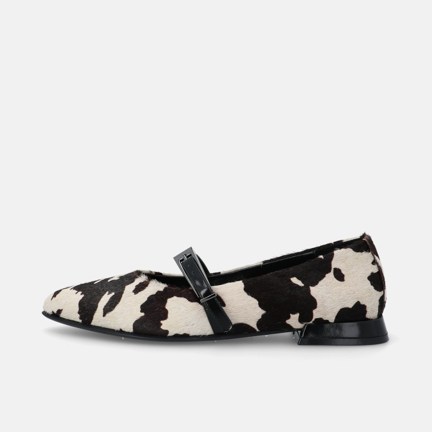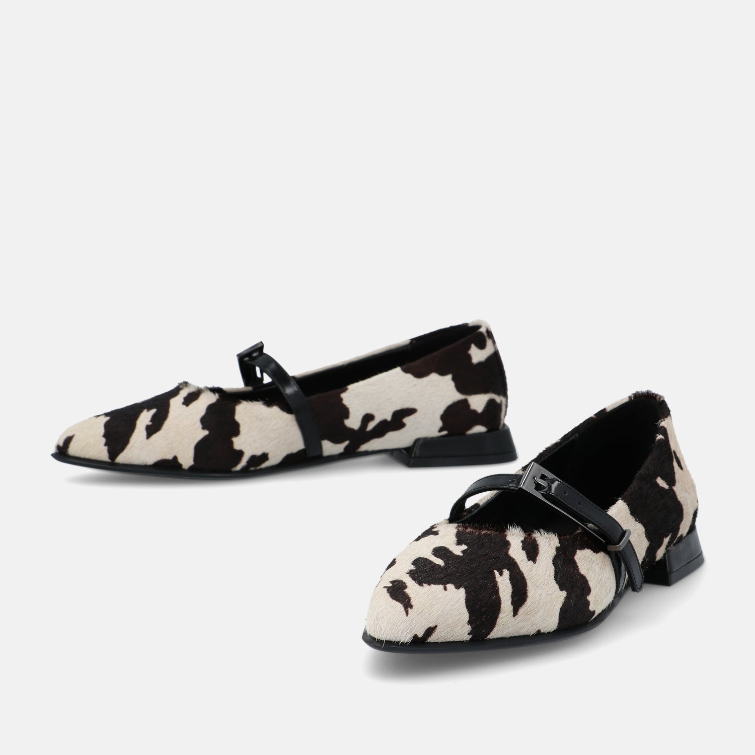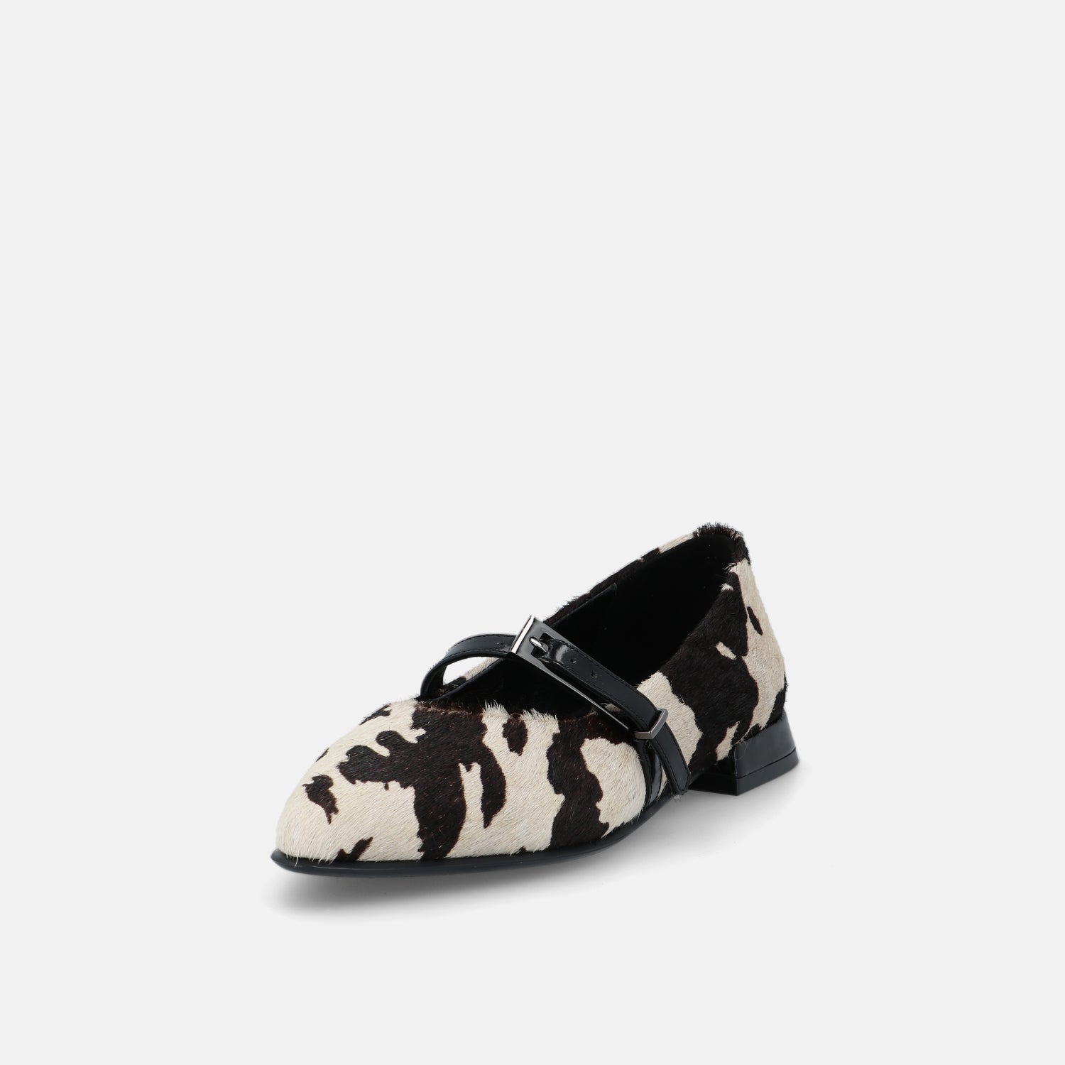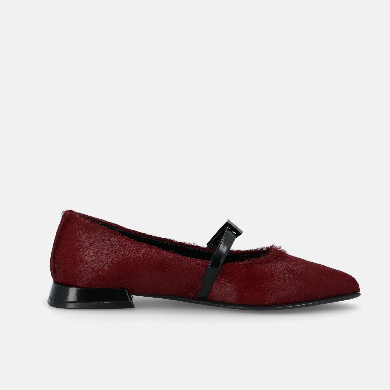 The Lim Argot ballerinas combine sophisticated design and refined materials in a bold version. Crafted from leather with a ponyskin upper , they come in two colors: a bold cowhide print , with a bold and contemporary appeal, or an intense antique red , which exudes elegance and personality. The tapered line and thin strap with a black leather buckle create the perfect balance between femininity and urban style.