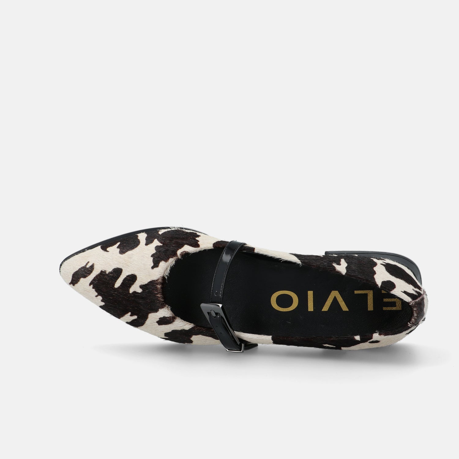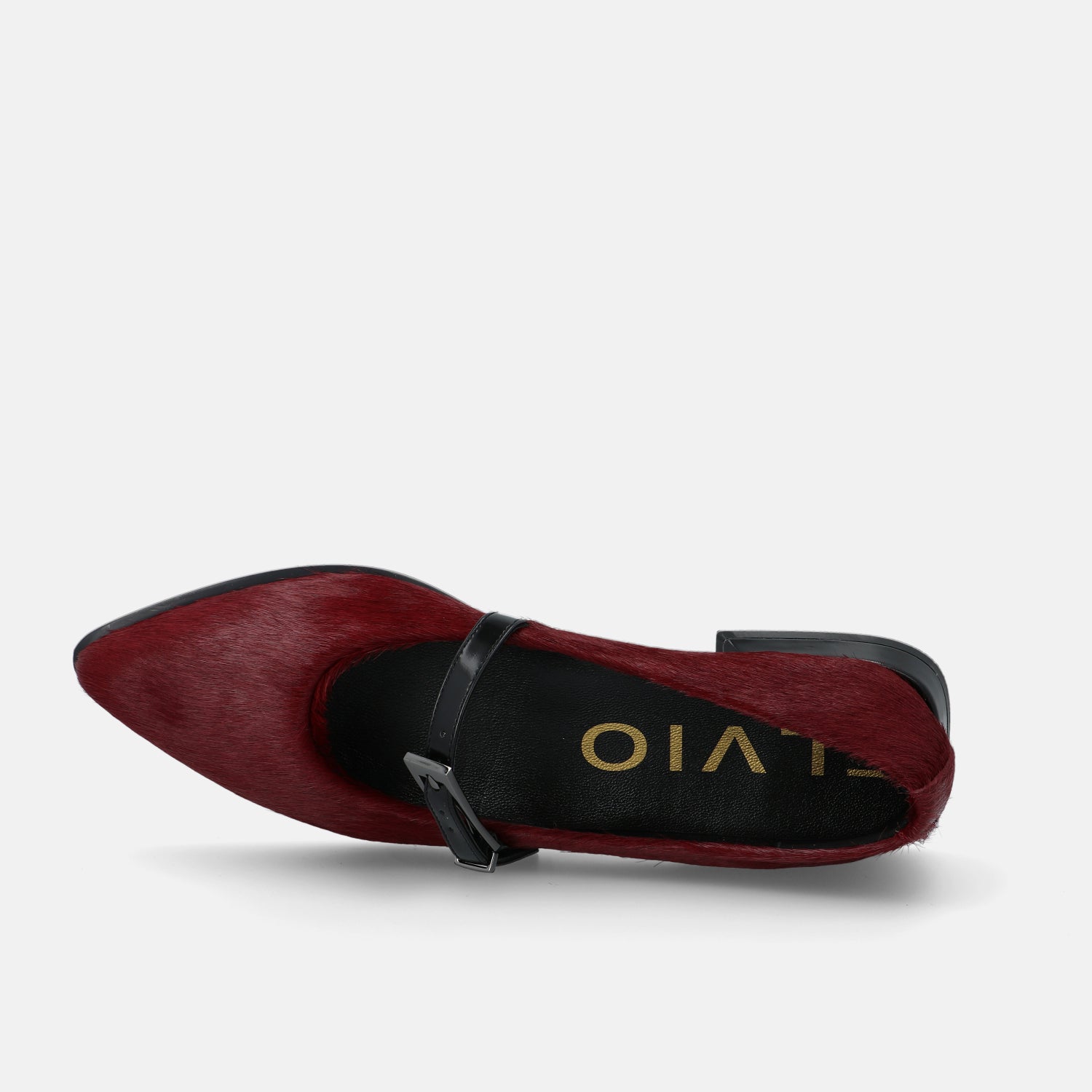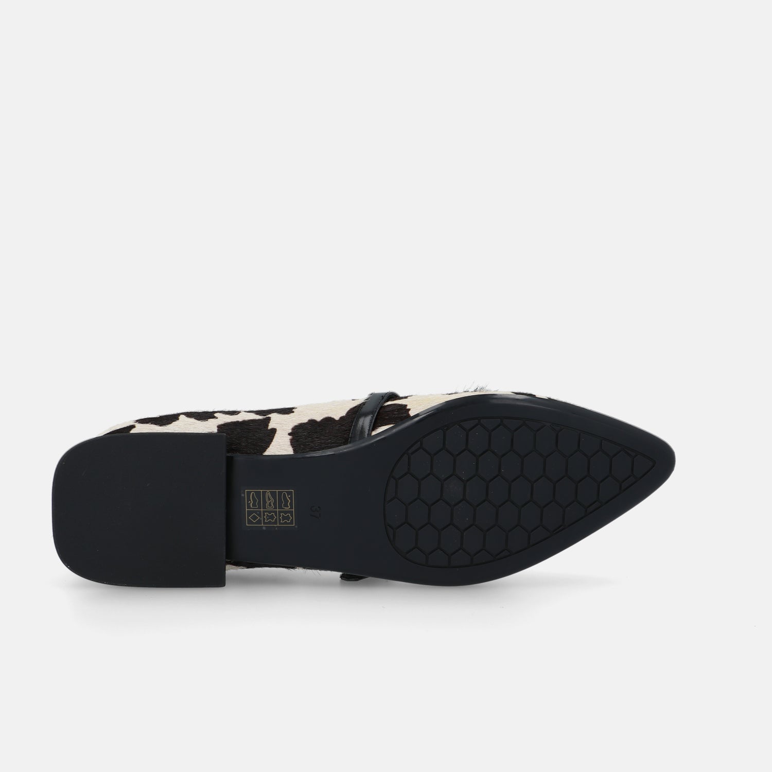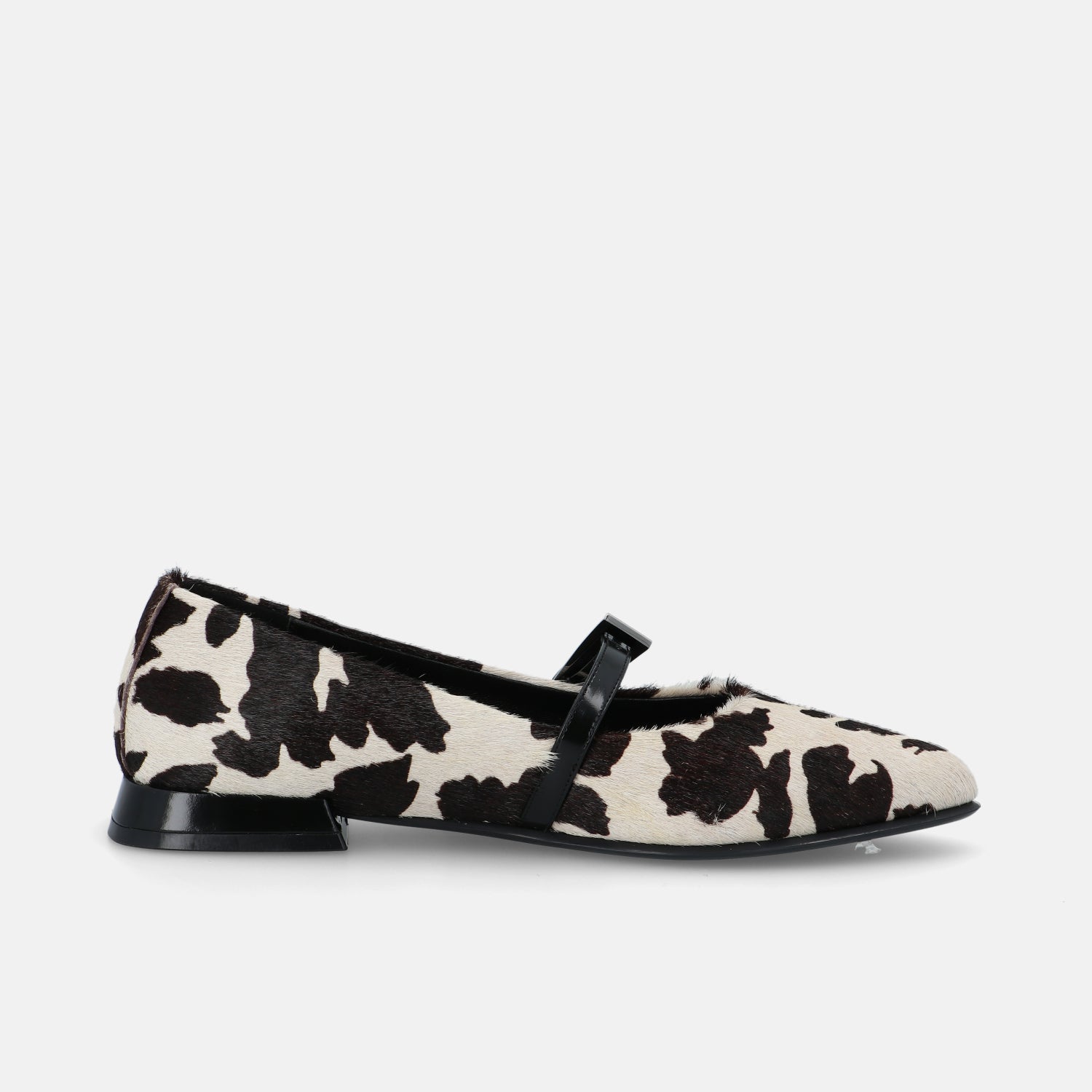 The Lim Argot ballerinas combine sophisticated design and refined materials in a bold version. Crafted from leather with a ponyskin upper , they come in two colors: a bold cowhide print , with a bold and contemporary appeal, or an intense antique red , which exudes elegance and personality. The tapered line and thin strap with a black leather buckle create the perfect balance between femininity and urban style.